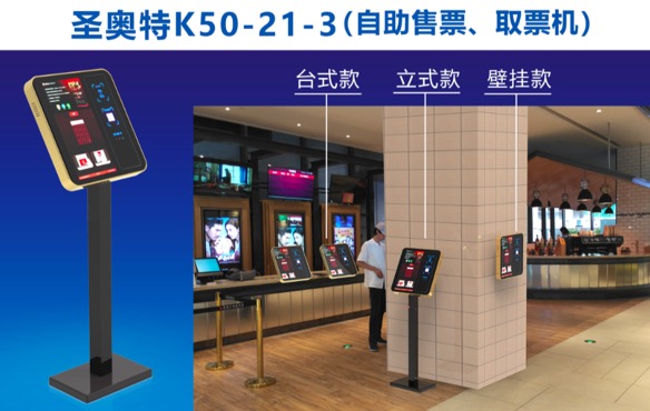 天億影城采用了圣奧特K50壁掛式取票機(jī)。此款取票機(jī)還可采用臺式、立式,靈活的多場景應(yīng)用。