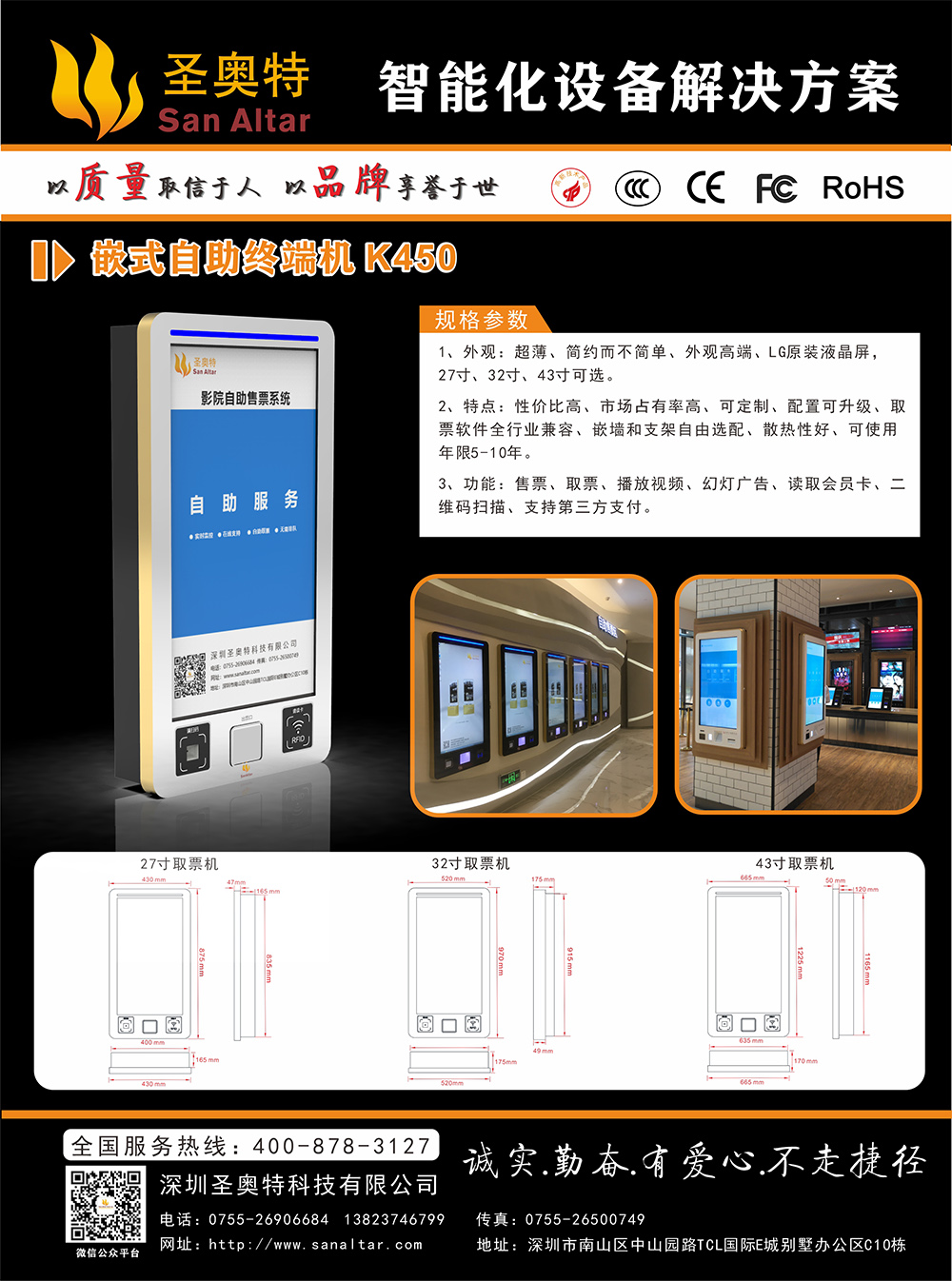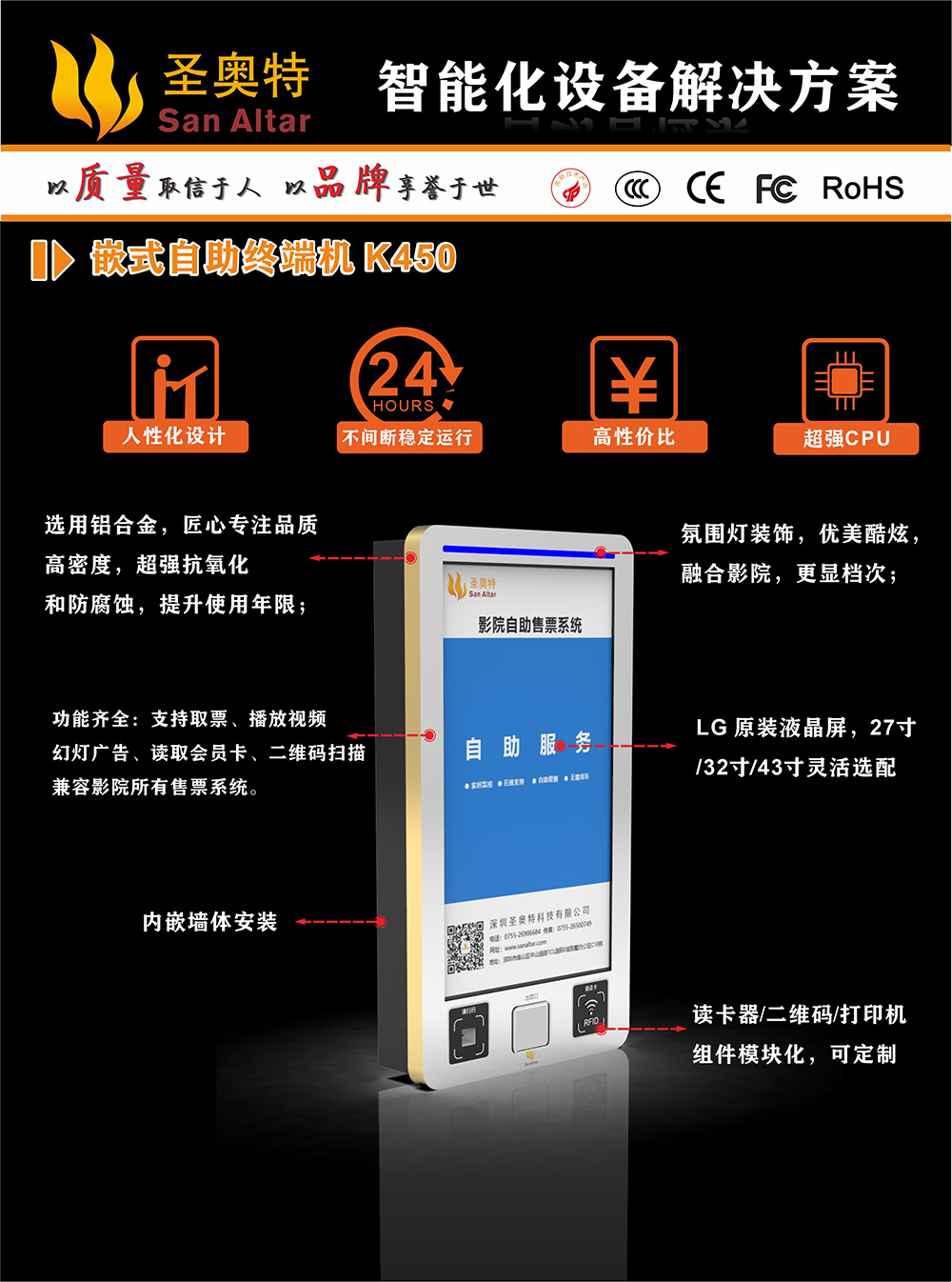 K450系列自助終端機 廣泛應(yīng)用于:智慧影院 智慧景區(qū) 智慧場館 智慧醫(yī)院等