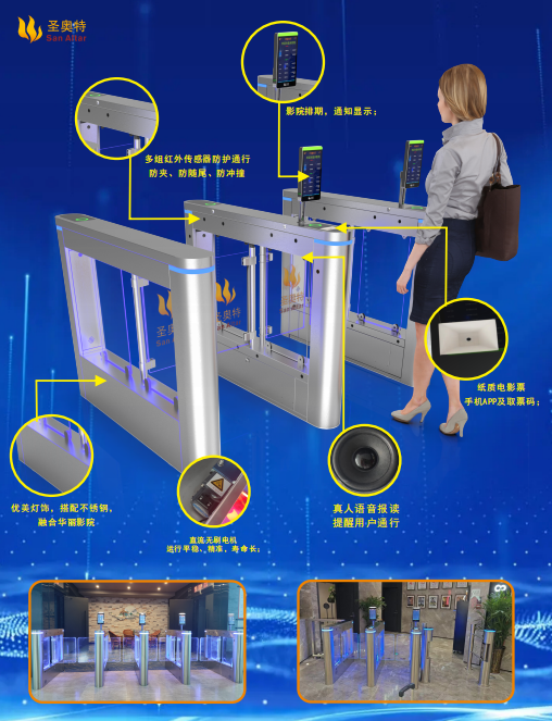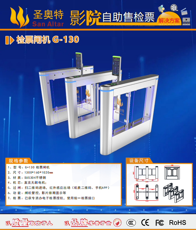 影院的高配置不光體現(xiàn)在放映和音響設(shè)備上,檢票設(shè)備同樣也是高端大氣的智能檢票閘機(jī)-圣奧特提供的G130款閘機(jī)。